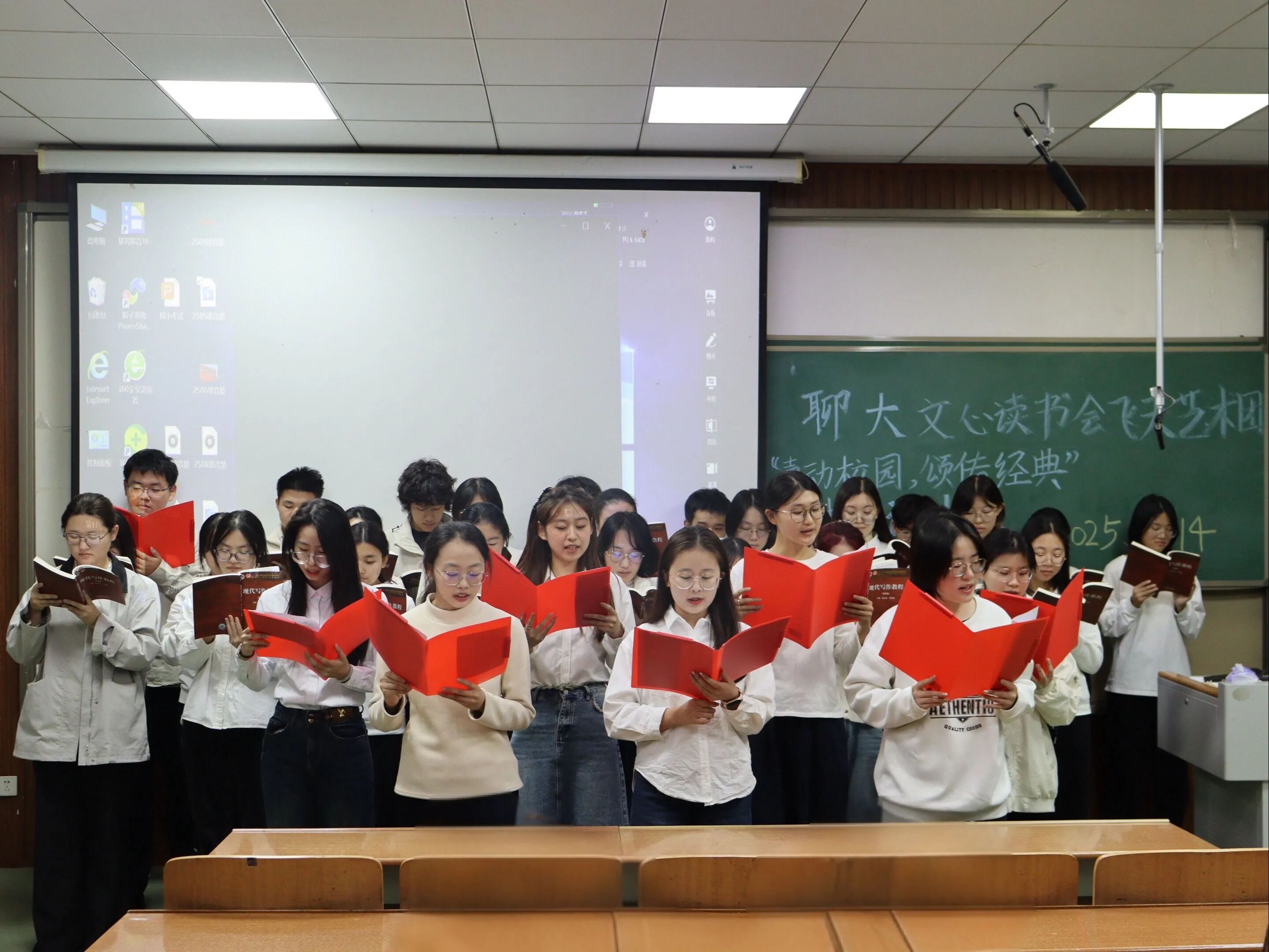 2501班以一场跨越时空的对话,串联起鲁迅笔下的民族忧思与当代神舟航天的壮丽图景。诵读声由“山河锦绣”的描绘,延伸至“盛世如你所愿”的誓言,在历史与现实的交响中,完成了一场百年精神传承。集体合诵铿锵有力,道出全体中华儿女的心声——“放不下的是血脉里的中国梦”。2506班巧妙融书法于诵读,以“国泰民安”“山河锦绣”两幅劲笔挥就赤子情怀。伴随墨韵,朗诵声由“破旧的老水车”的沧桑回响,到“新刷出的雪白起跑线”的时代强音,抒发了与祖国同心共进的赤子丹心。2507班则以一段情景剧引入朗诵,由两名同学饰演革命志士,生动诠释了“为中华民族尽力”的如磐初心。剧情落幕,朗诵声起,全班齐诵李大钊《青春》选段——“以青春之我,创建青春之家庭,青春之国家……”,从救亡图存的历史叙事,自然过渡到青春建功的时代召唤。